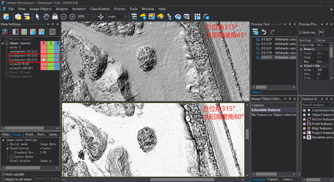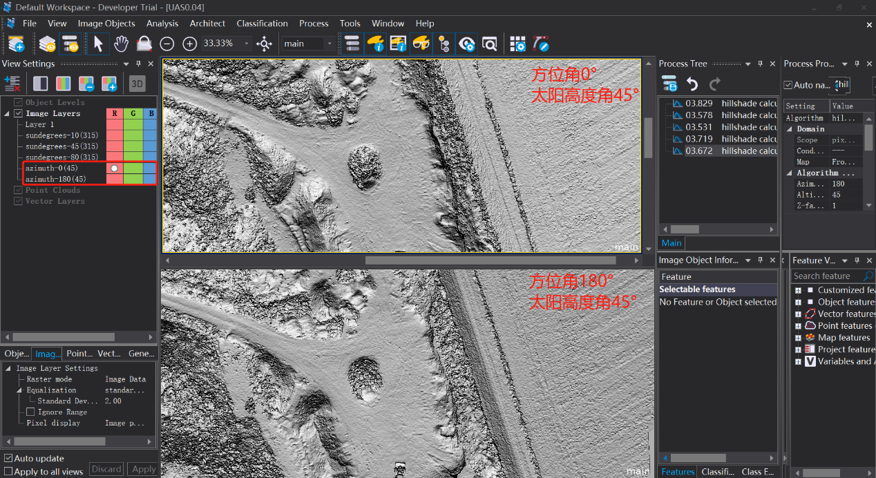 eCognition v10.1版本新增山体阴影算法,山体阴影的效果主要由azimuth(degrees)和altitude(degrees)两个因子控制。本周我们通过控制变量法进行了山体阴影效果的对比,下面让我们一起来看看吧。