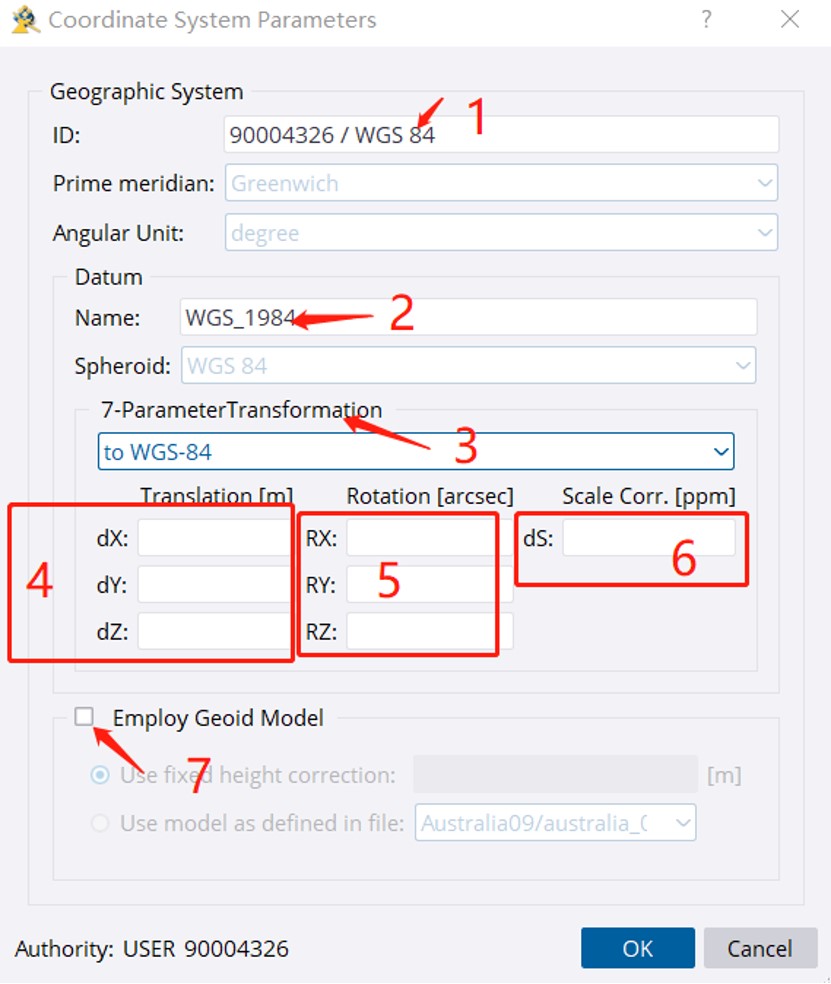 1处可修改为当前项目的名称;2处不用修改;3处选择from WGS-84坐标系;(这里的from或者to取决七参数计算的坐标方向);4处填入7参数中的三个线元素,单位米(将求得的三个参数取反,留4位小数);5处填入7参数中的三个角元素,单位秒(将求得的三个参数*206265,留5位小数);6处填入7参数中的一个比例因子,单位ppm(将求得的参数*1000000,留8位小数);在7处填入由两套控制点坐标求得的平均高程差值(或者自己制作一个精化水准面,选择自定义的精化水准面模型)。