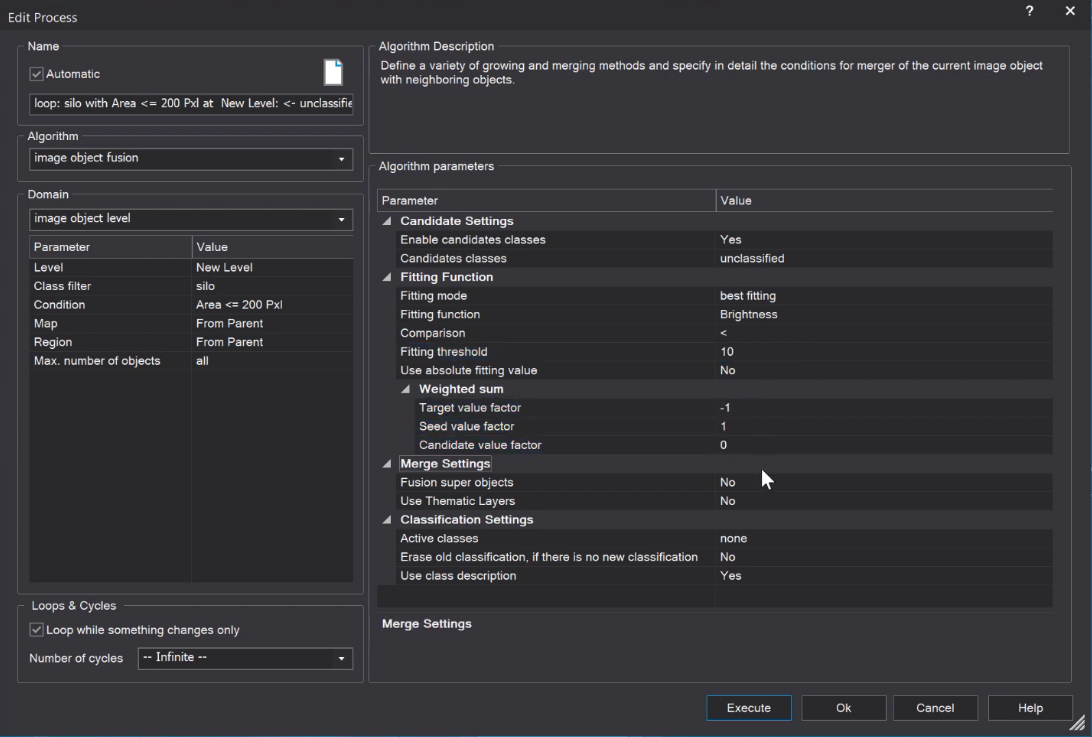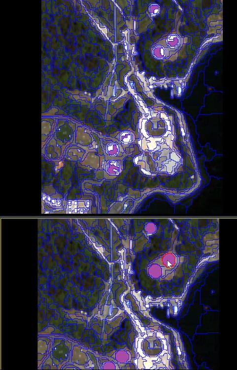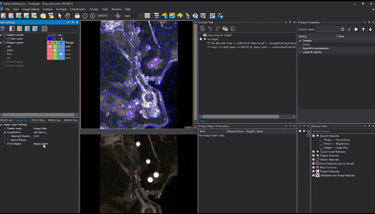 2 影像对象融合规则集设置,在soil类别中,当选择了roundness拟合特征后,会自动生成拟合阈值和对象之间的权重值,点击执行,结果视图中下方的是执行规则集后的效果