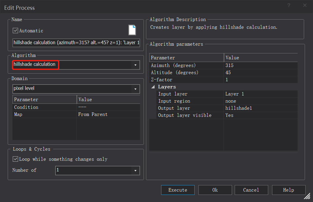 第二步:在进程树栏目中右击/Add new process,选择hillshade calculate算法,按照下方表1中的算法参数进行多次算法创建,通过变化方位角和太阳高度角(azimuth(degrees)&altitude(degrees))来得出不同的效果。如下所示: