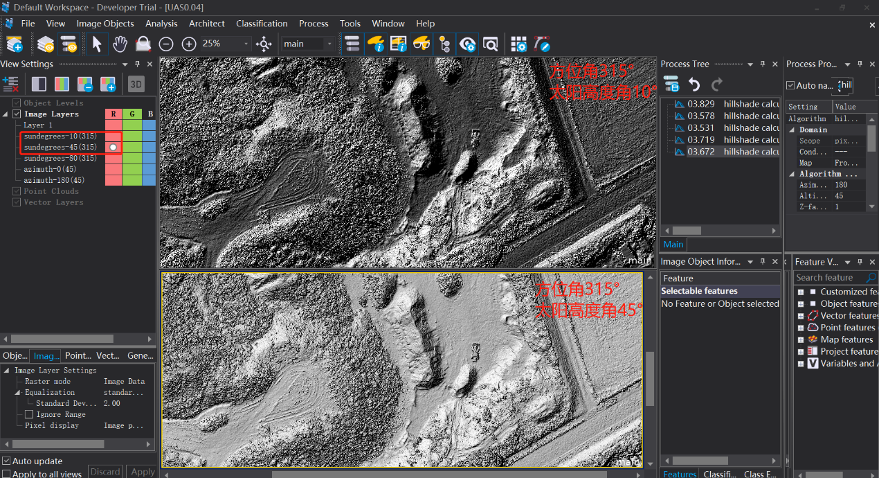 eCognition v10.1版本新增山体阴影算法,山体阴影的效果主要由azimuth(degrees)和altitude(degrees)两个因子控制。本周我们通过控制变量法进行了山体阴影效果的对比,下面让我们一起来看看吧。